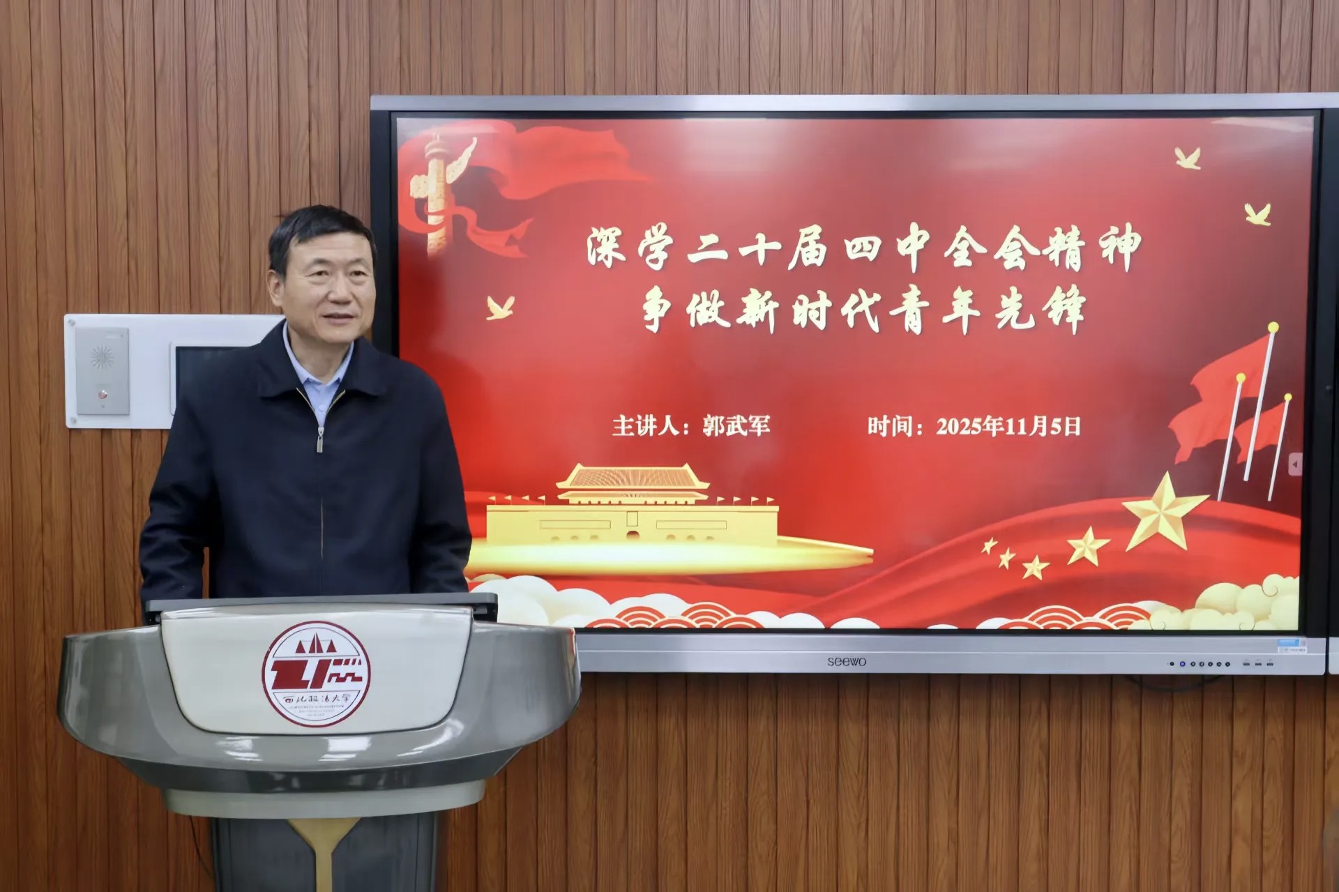 为深入学习贯彻党的二十届四中全会精神,教育引导新生筑牢思想根基、找准青春坐标,11月5日下午,校党委副书记郭武军以“深入学习贯彻党的二十届四中全会精神,争做新时代先锋青年”为题,为经济学院2025级新生讲授专题思政课。会议由经济学院党委副书记、副院长侯颖怡主持。