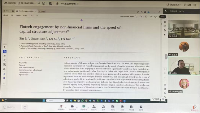 2026年4月2日(星期四)下午,经济学院学术系列讲座通过腾讯会议采取线上线下相结合的方式顺利召开。我院邀请到金融学博士、《Economics & Politics》杂志主编、博士生导师、澳大利亚阿德莱德大学商学院徐磊教授作题为《金融科技参与与非金融企业资本结构调整速度》学术讲座。本次讲座由西北政法大学经济学院金融系陈小勇教授主持,线上线下经济学院师生70余人参加了此次讲座。