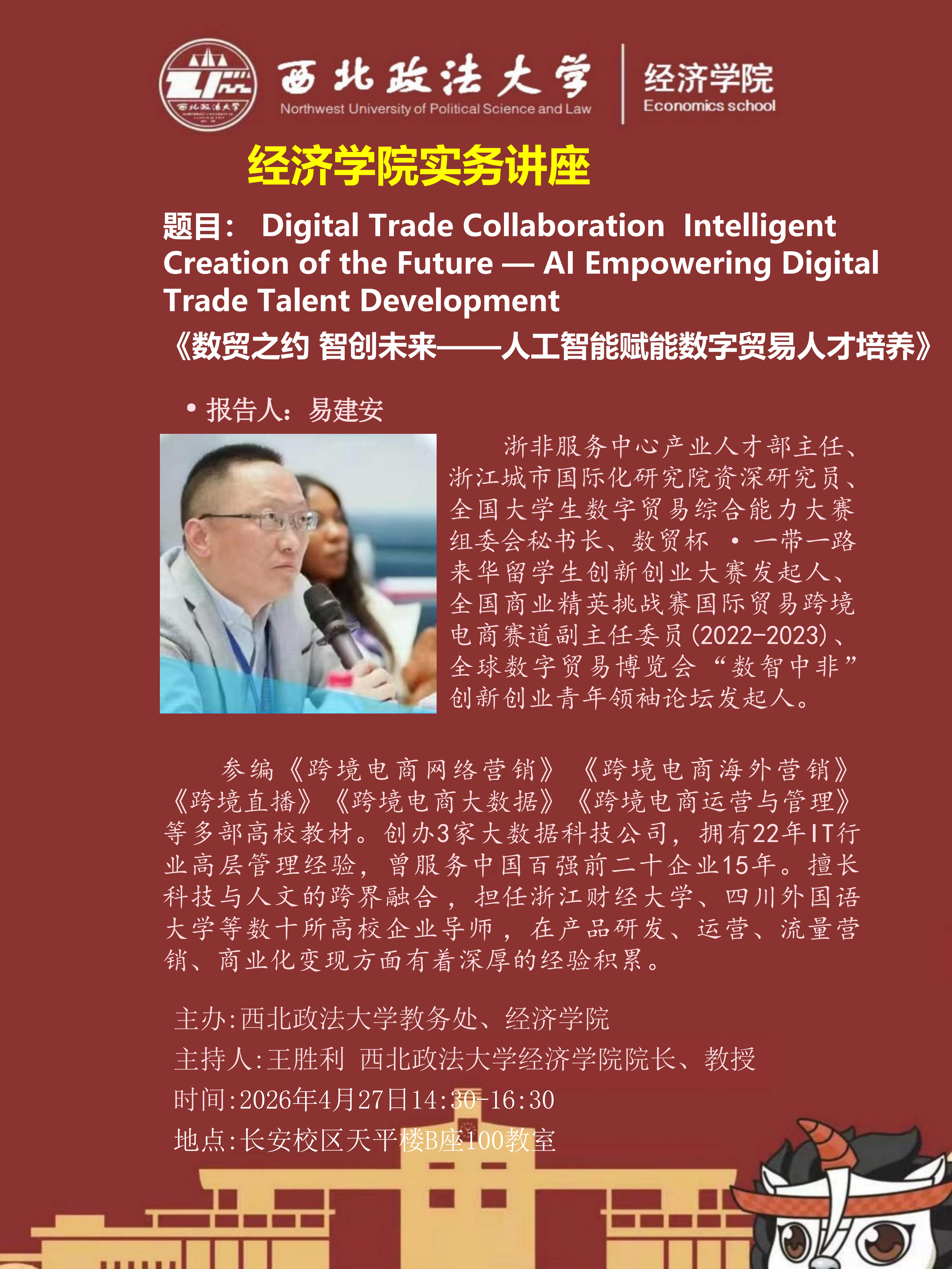 为顺应国际贸易数字化转型发展趋势,聚焦人工智能赋能人才培养模式创新,经济学院特邀全国大学生数字贸易综合能力大赛组委会秘书长易建安来校举办专题讲座,为学生创造更多了解数字贸易领域前沿理论与实践的交流机会,现将具体安排通知如下: