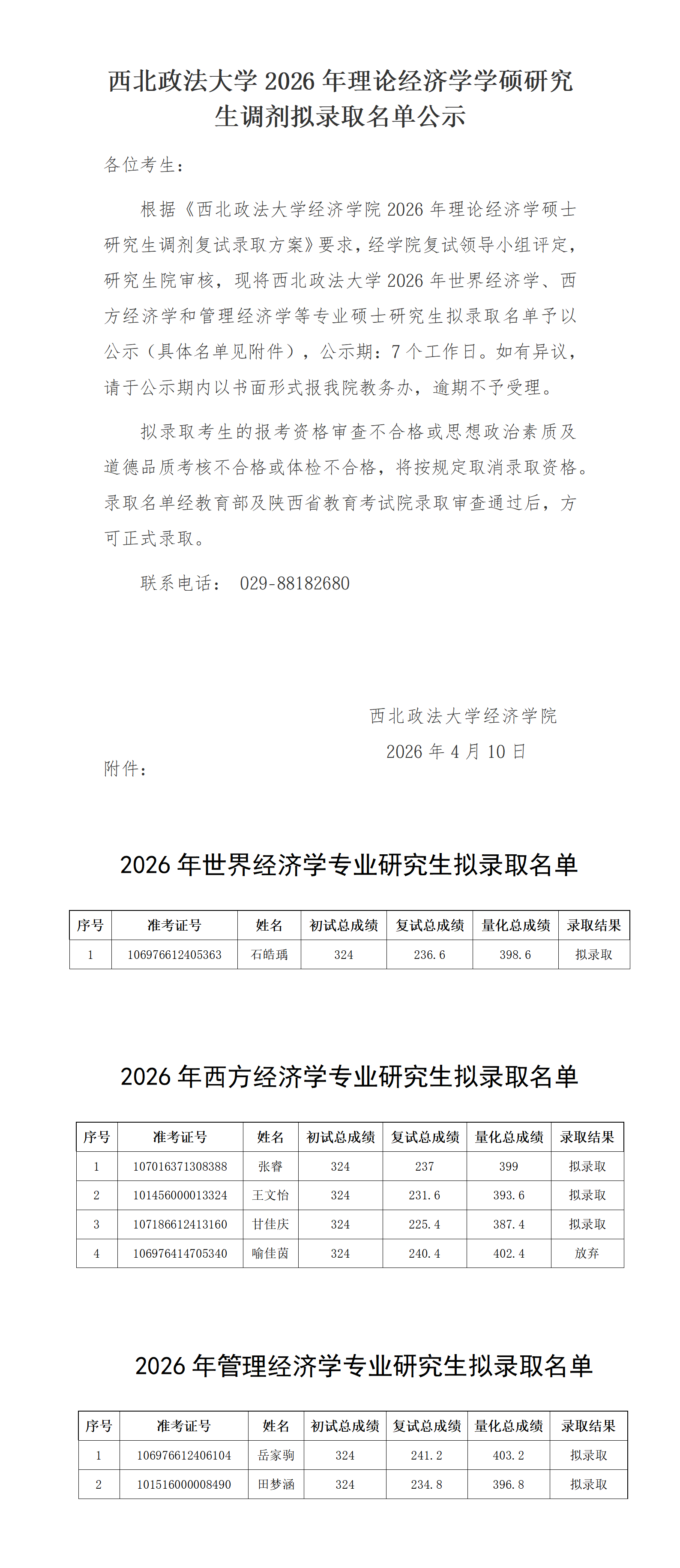 西北政法大学2026年理论经济学学硕研究生调剂拟录取名单公示